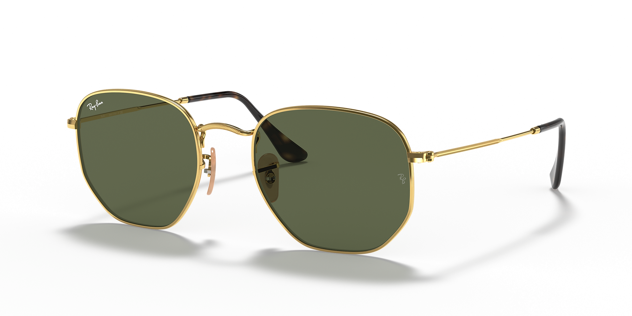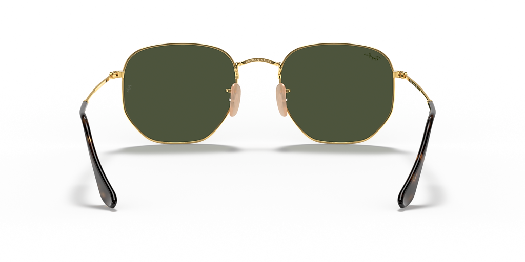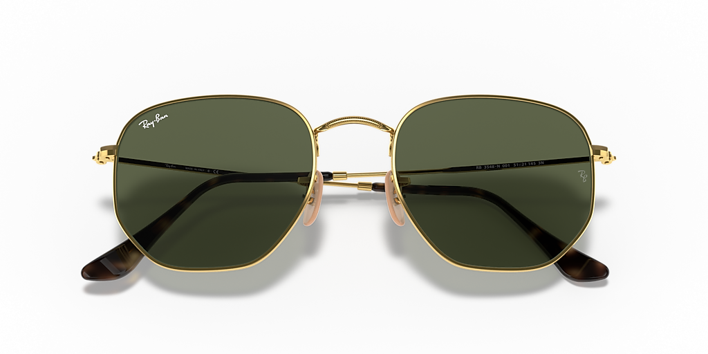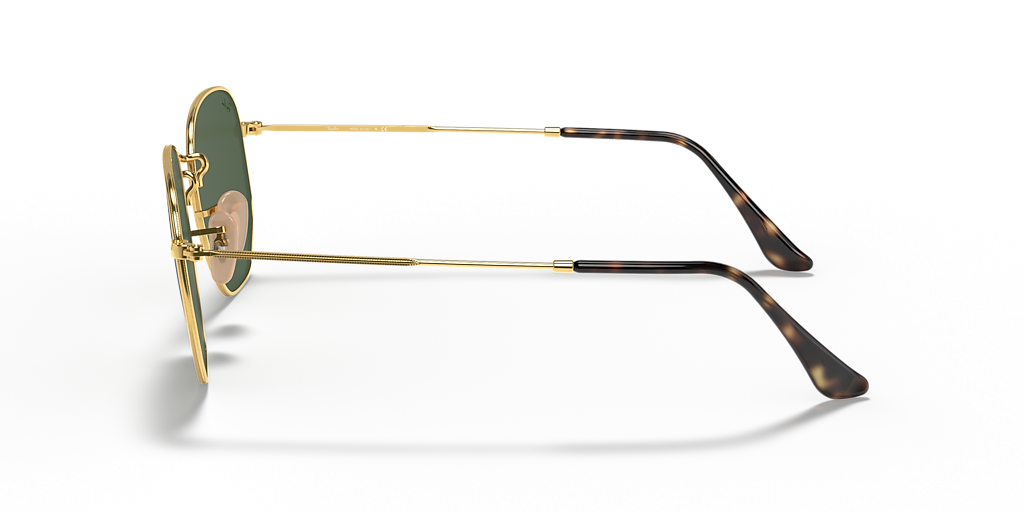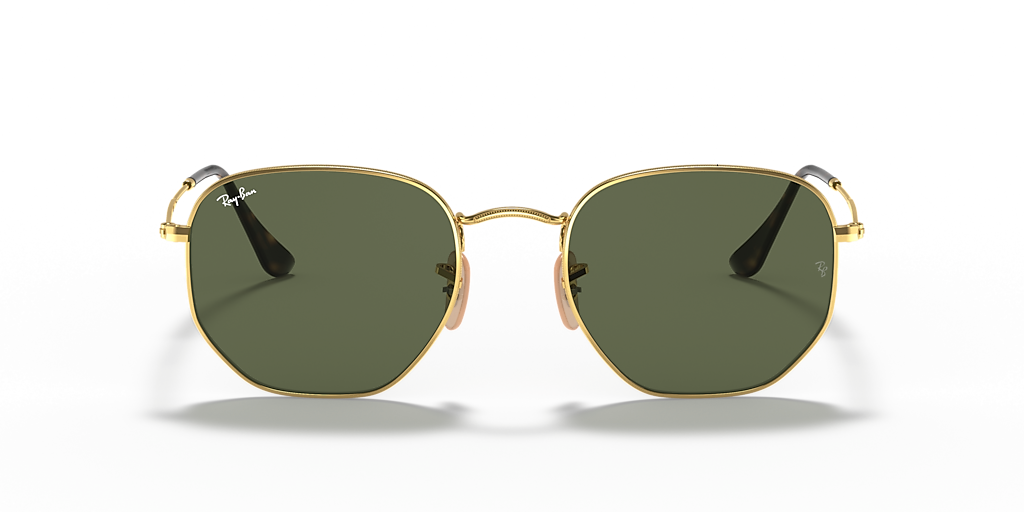 Ray-Ban Hexagonal Flat Lenses are a new take on the iconic metal hexagon shape, featuring an irregular frame design. With its classic g-15 green lenses and gold metal frame, these sunglasses are perfect for those looking for something unique but still want to keep it classy.